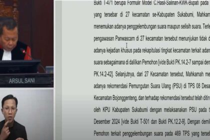 JUBIRTVNEWS.COM – Mahkamah Konstitusi (MK) menolak gugatan terkait Perselisihan Hasil Pemilihan Umum (PHPU) pada Pilkada Kabupaten Sukabumi Tahun 2024 yang diajukan oleh Pasangan Calon Bupati da...