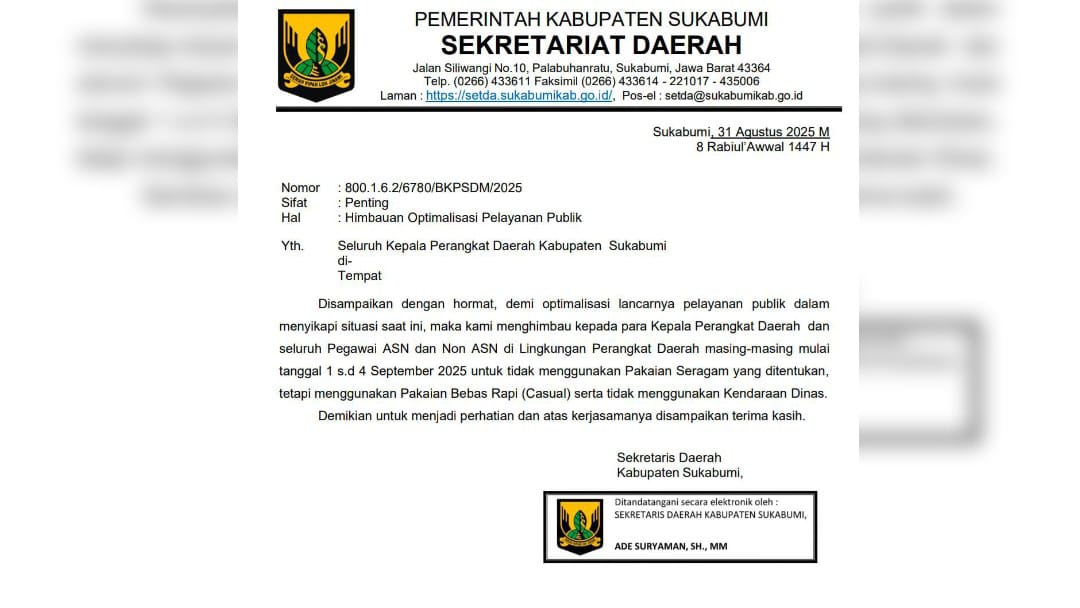Melalui Surat Edaran Nomor 800.1.6.2/6780/BKPSDM/2025, Sekretaris Daerah Kabupaten Sukabumi, Ade Suryaman, menghimbau seluruh pegawai di lingkungan perangkat daerah untuk tidak menggunakan seragam dinas pada 1–4 September 2025. Sebagai gantinya, ASN dan Non ASN diminta mengenakan pakaian bebas rapi (casual).