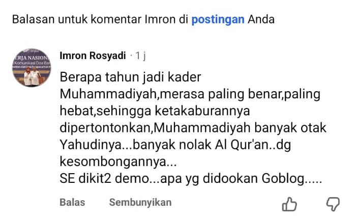 Dalam kolom komentar, akun yang belakangan diketahui milik pria lansia bernama Imron Rosyadi Mas’ali tersebut menuliskan narasi yang diduga menyerang martabat organisasi Muhammadiyah dengan menyebut “banyak otak Yahudi” dan kalimat tidak pantas lainnya.