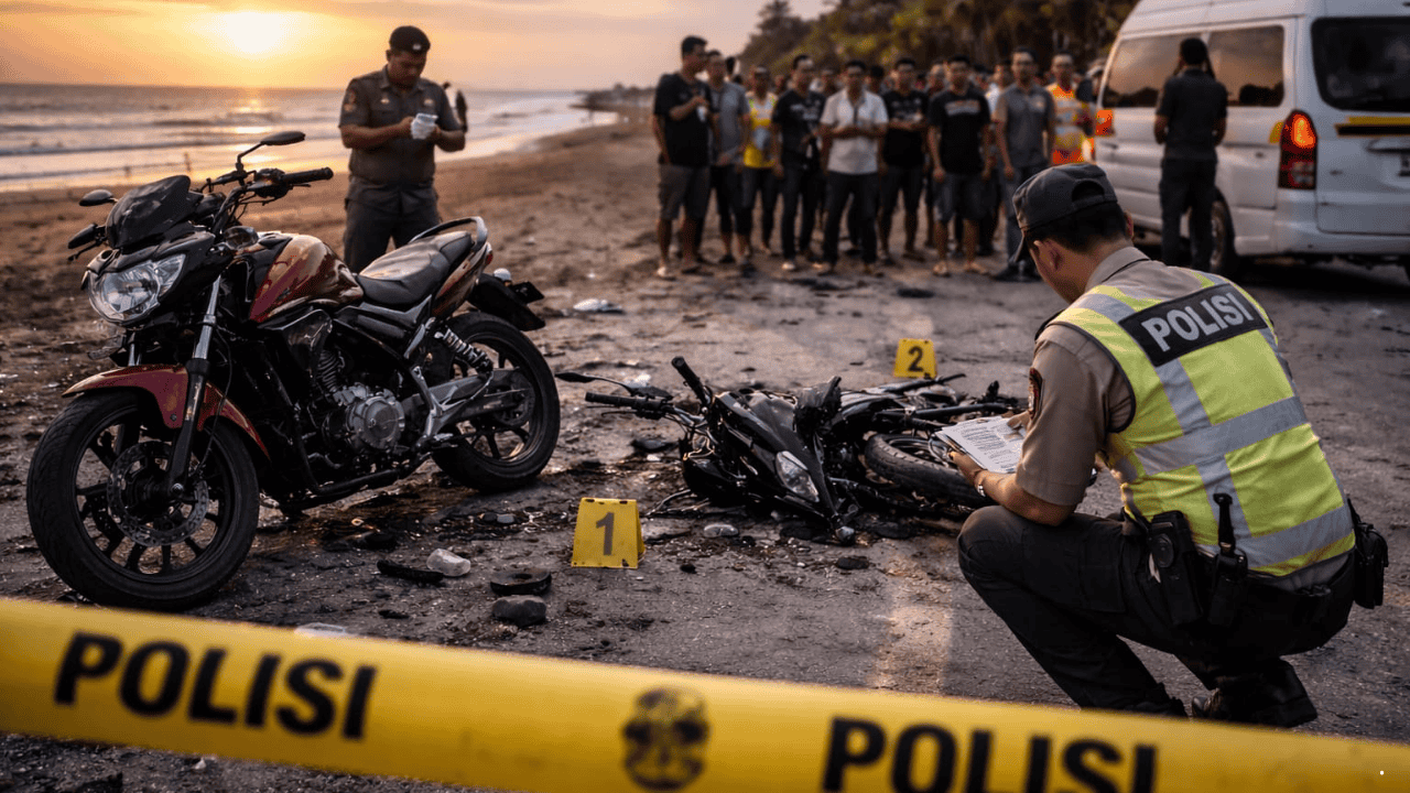 Dari keterangan sementara di lapangan, kecelakaan diduga terjadi saat salah satu pengendara tengah melakukan uji coba kendaraan di area pesisir. Pada saat bersamaan, pengendara lain melaju dari arah belakang dengan kecepatan tinggi hingga terjadi benturan keras.