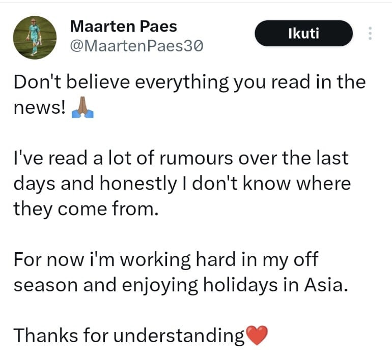 JUBIRTVNEWS.COM – Penjaga gawang Timnas Indonesia, Maarten Paes, akhirnya angkat bicara terkait rumor kepindahannya ke klub Liga 1, Persib Bandung. Melalui unggahan di media sosial, Paes menegaskan kabar tersebut tidak benar dan tidak memiliki dasar yang jelas.