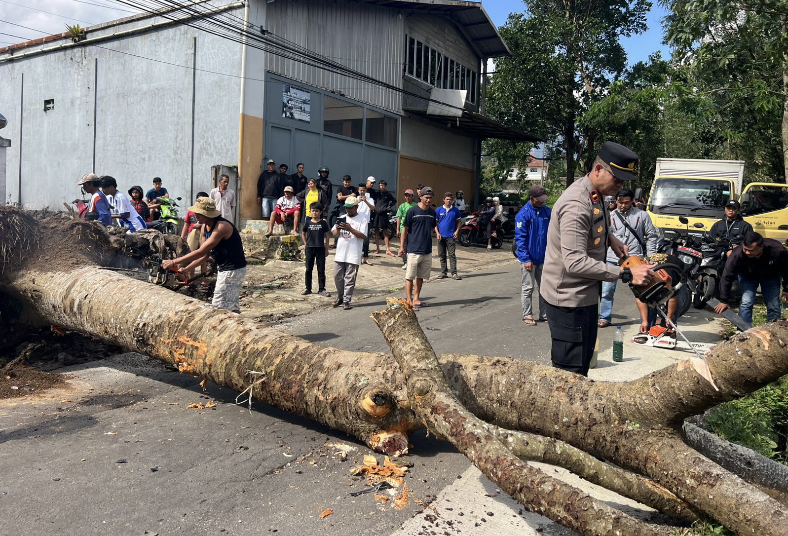 Proses evakuasi pohon tumbang yang menimpa motor di Jalan Situgunung, Kadudampit, Kabupaten Sukabumi | Foto: Polsek Kadudampit
