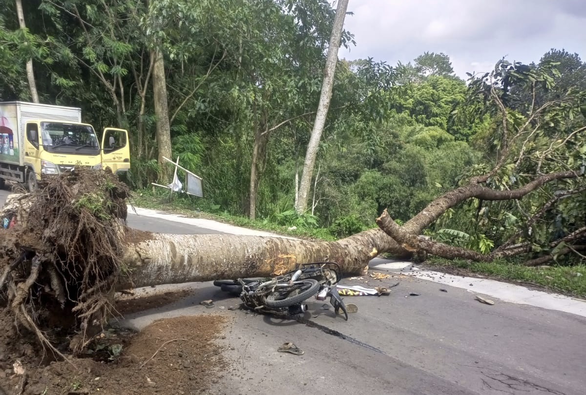 JUBIRTVNEWS.COM – Sebuah pohon tumbang dan menimpa sepeda motor yang sedang melintas di Jalan Situgunung Km 5, Kadudampit, Kabupaten Sukabumi, Sabtu (24/1/2026) sekitar pukul 14.20 WIB. Insiden ini dipicu oleh terjangan angin kencang yang melanda wilayah tersebut.